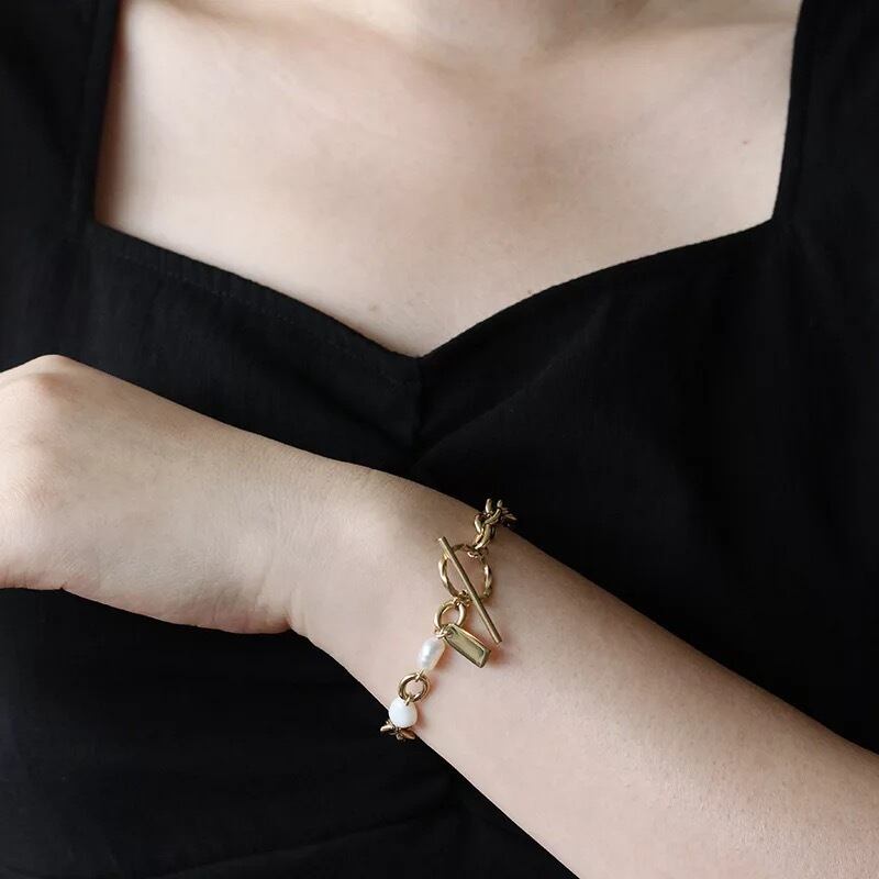 ゴールドトーンのチェーンがタイムレスでエレガントなブレスレットです^ ^