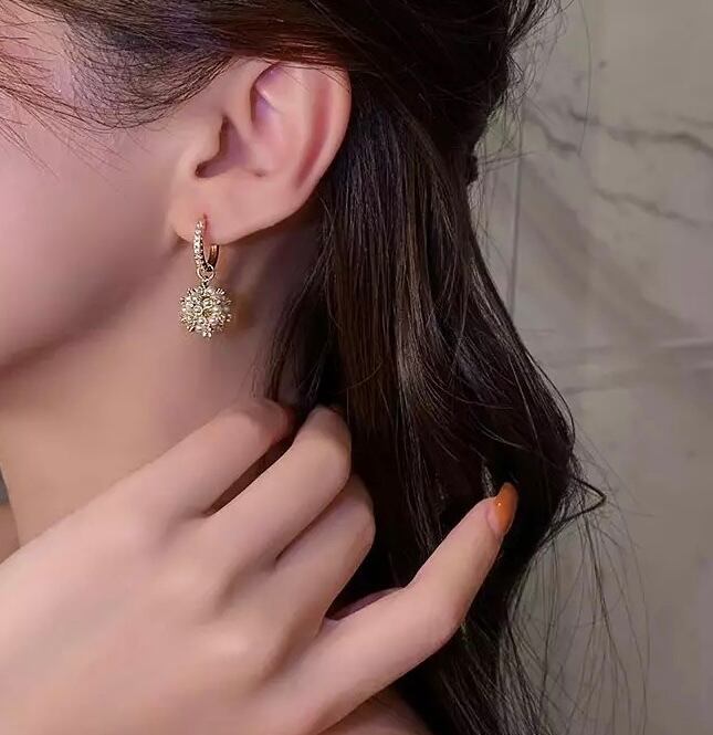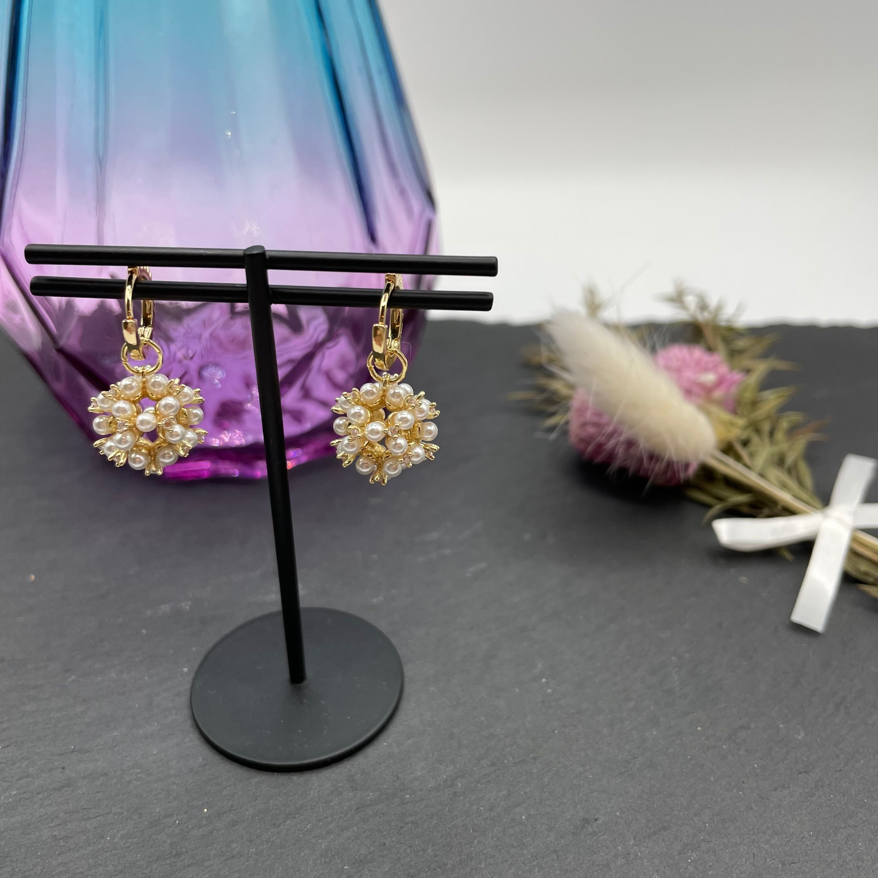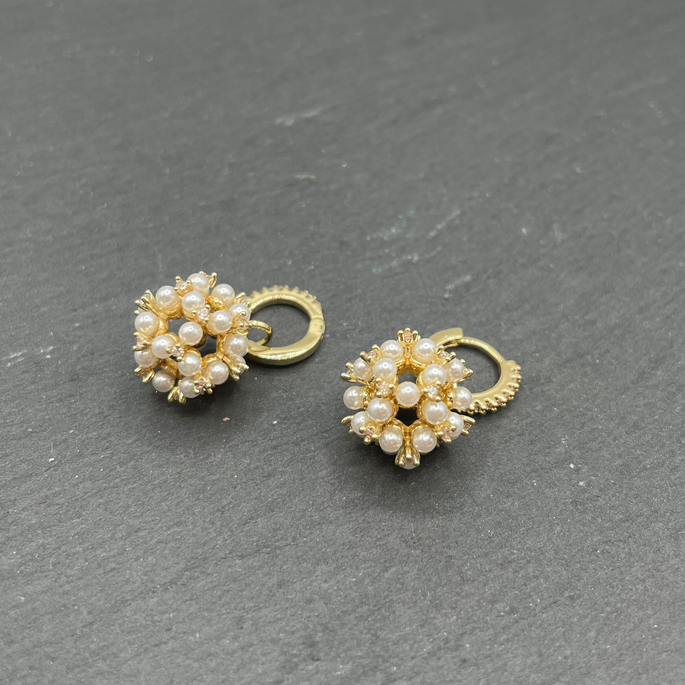 ゴールドカラーベースでホワイトのビーズにジルコニアを混ぜたボリュームのあるピアスです^ ^