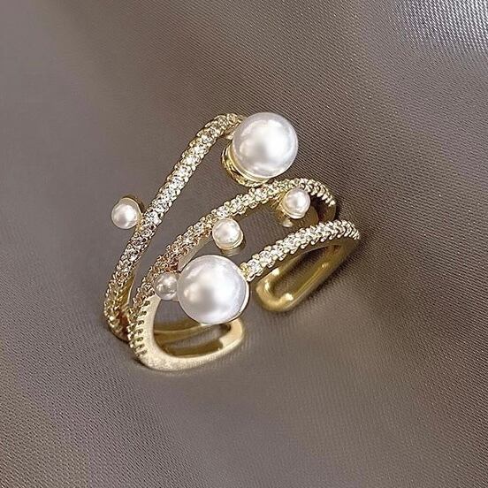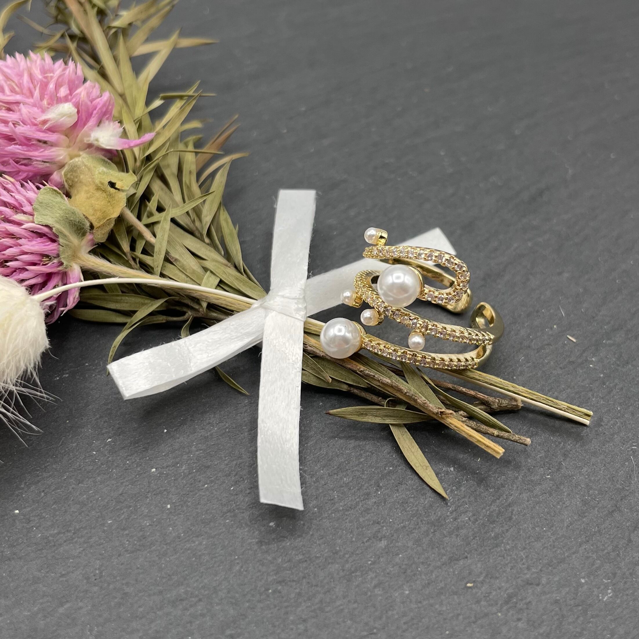3連風のゴールドデザインにジルコニア、淡水パールを加え、より大人な雰囲気を演出してくれます♪