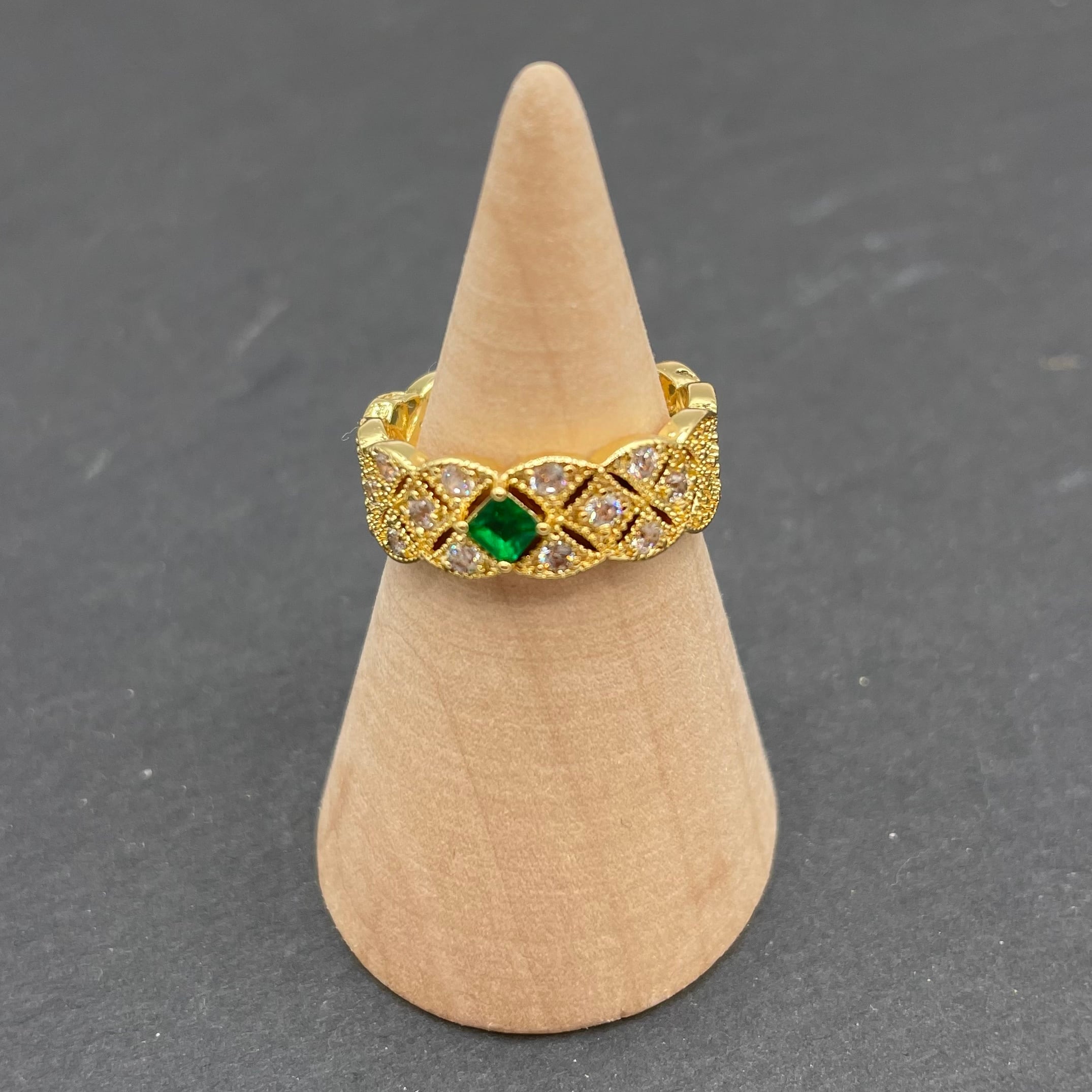ゴールドベースにジルコニアとセンターにワンポイントのグリーンストーンが施されたオープンリングです^ ^