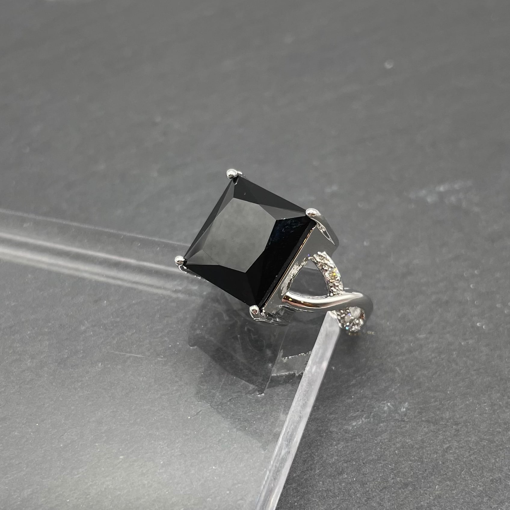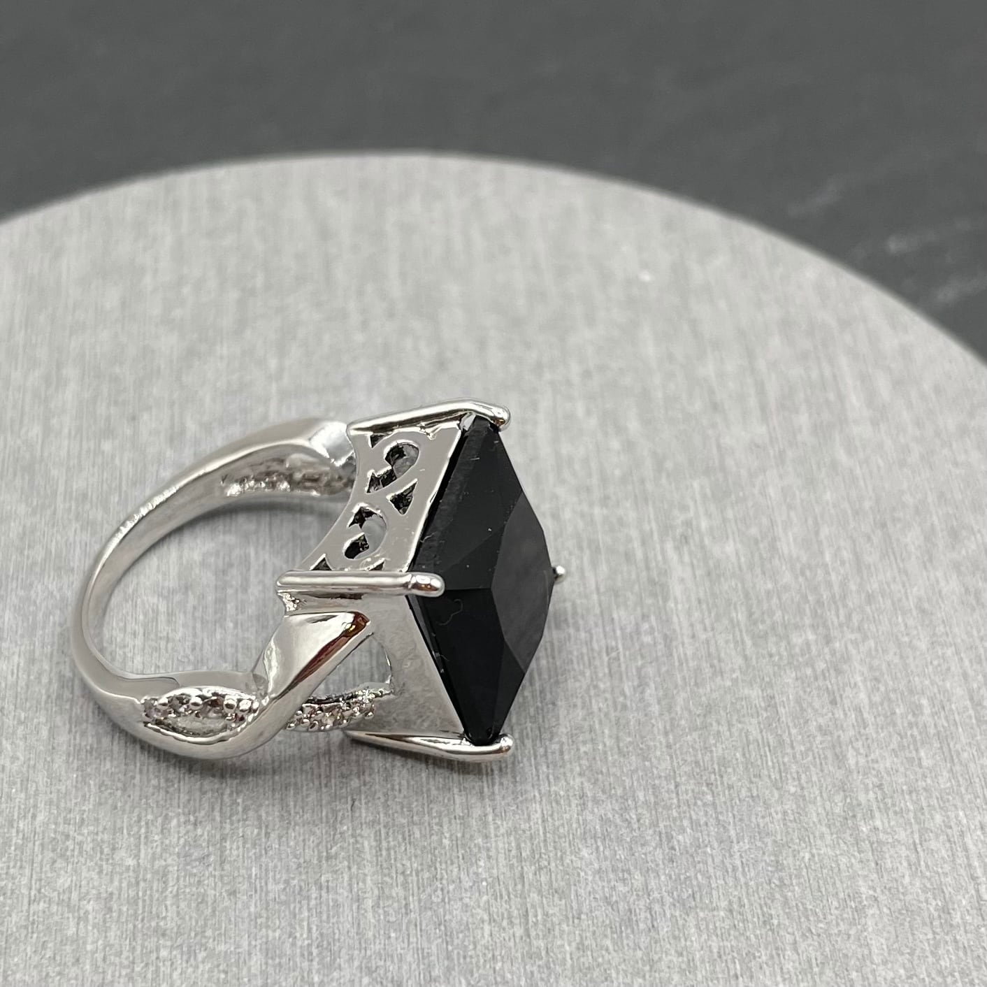 ブラックの大きいキュービックジルコニアとその周りにクリアのジルコニアが付いていて珍しいリングになります^ ^